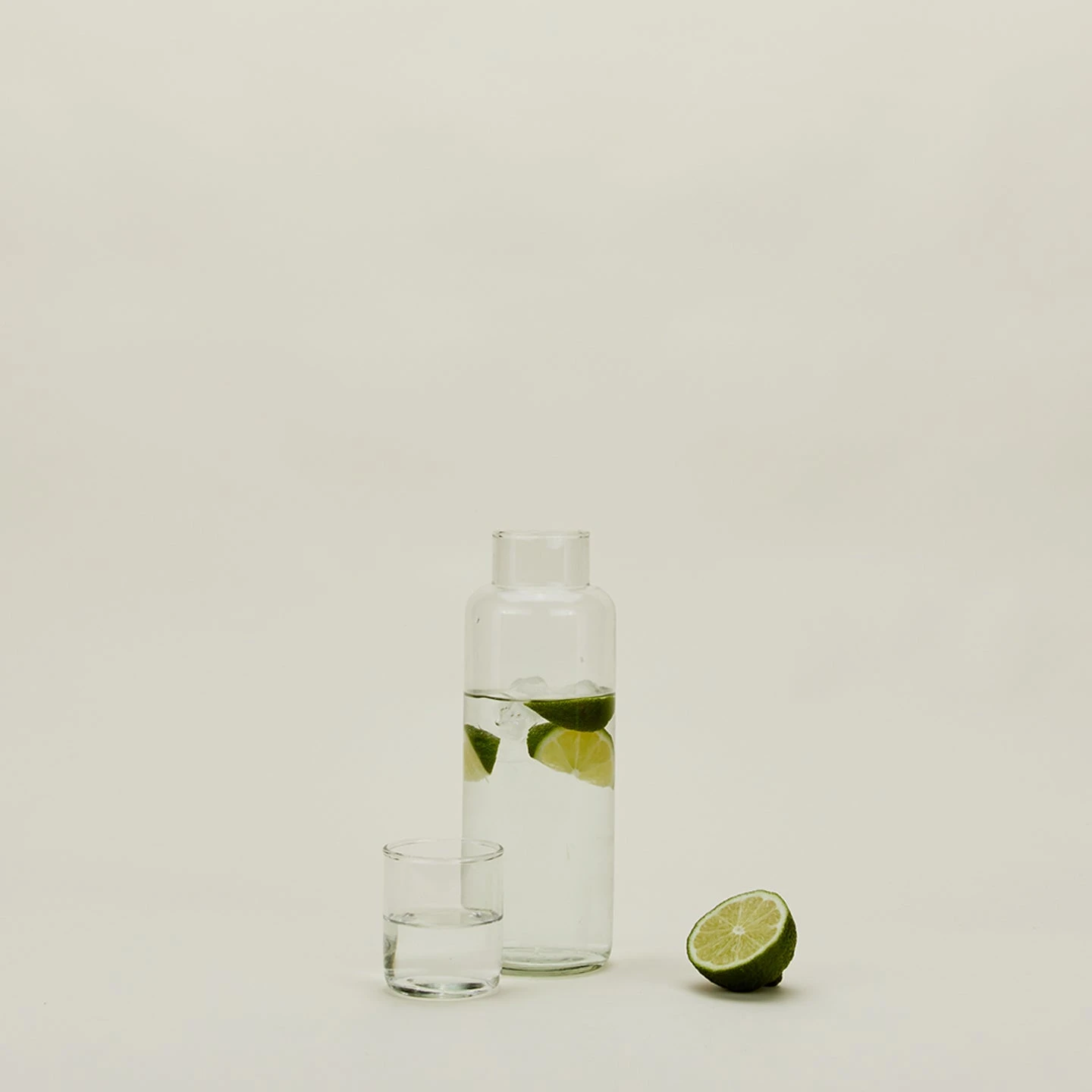 - Unique glass decanter + drinking glass combo made with recycled glass