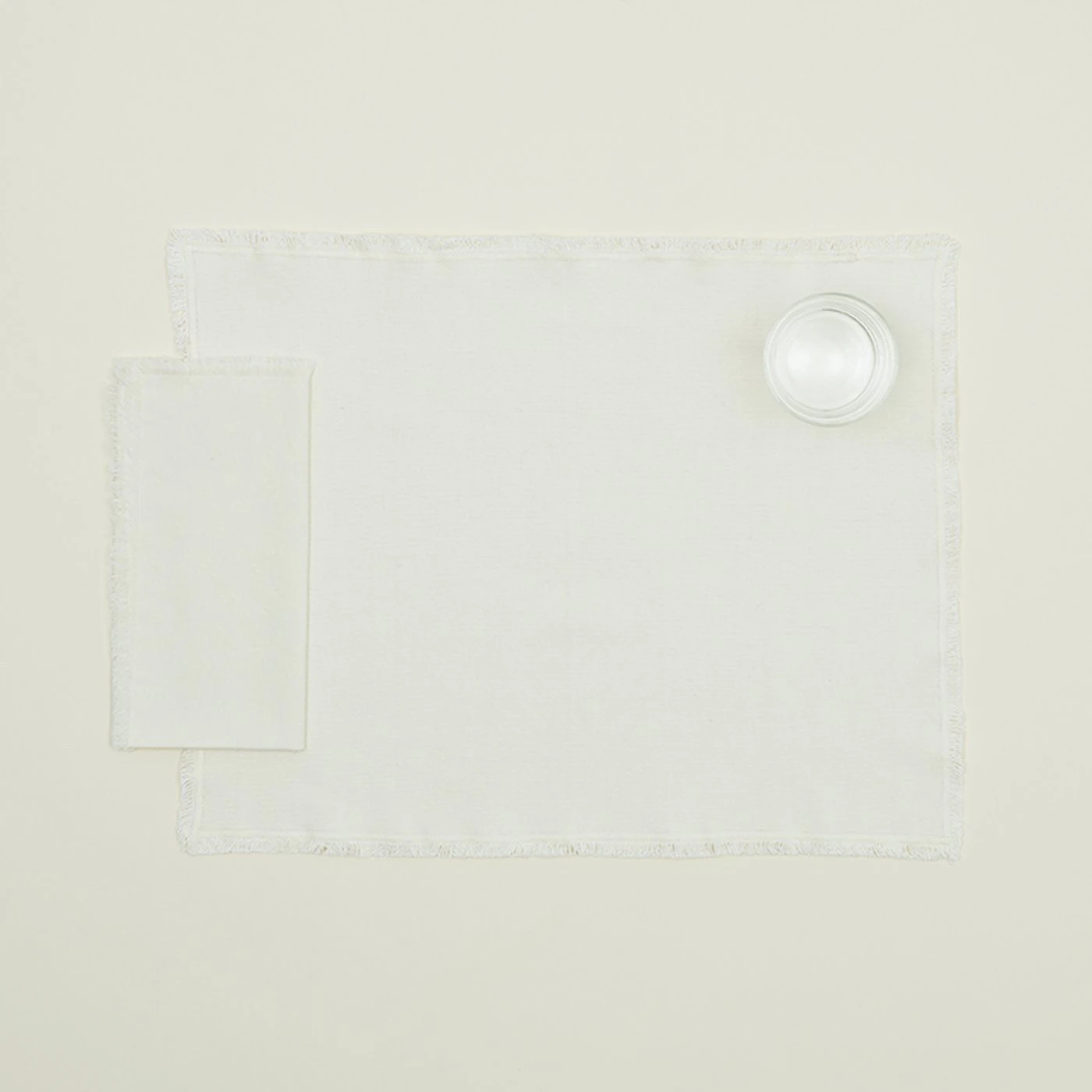 - Hand-dyed cotton dinner placemats, with a soft fringed edge