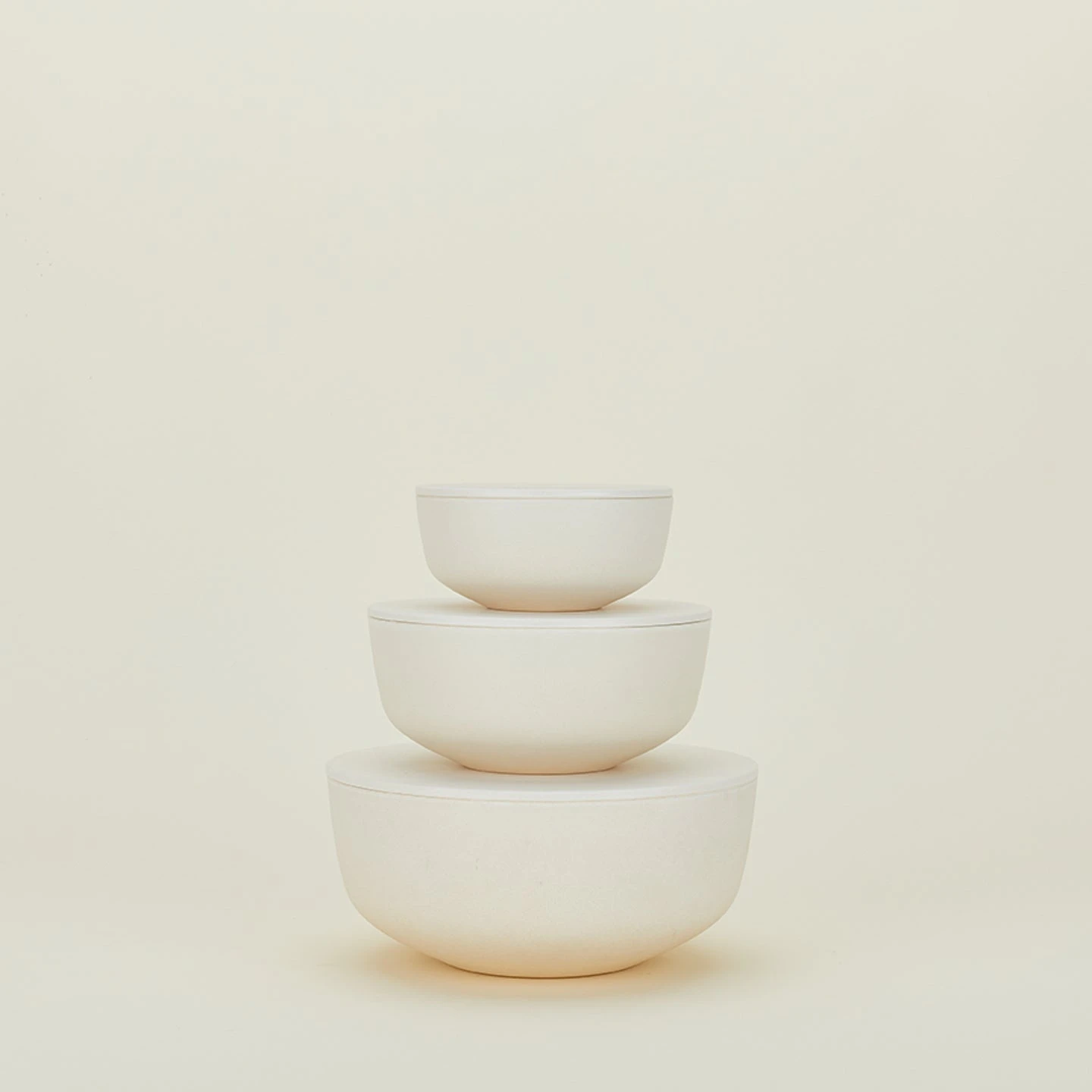 - A set of 3 nestable or stackable lidded bowls in Ivory