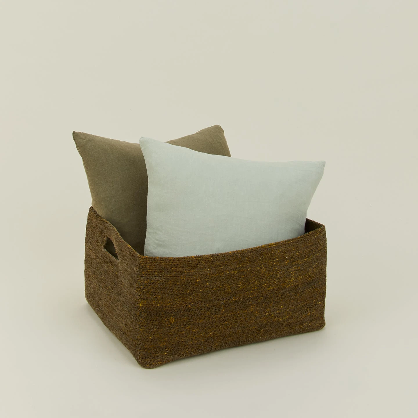 - A handwoven seagrass basket with handles for easy transport