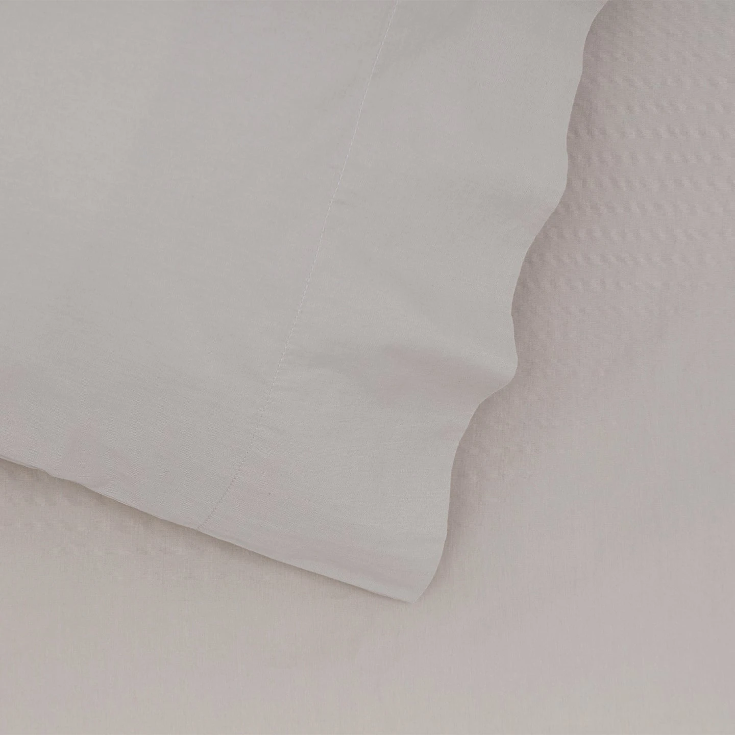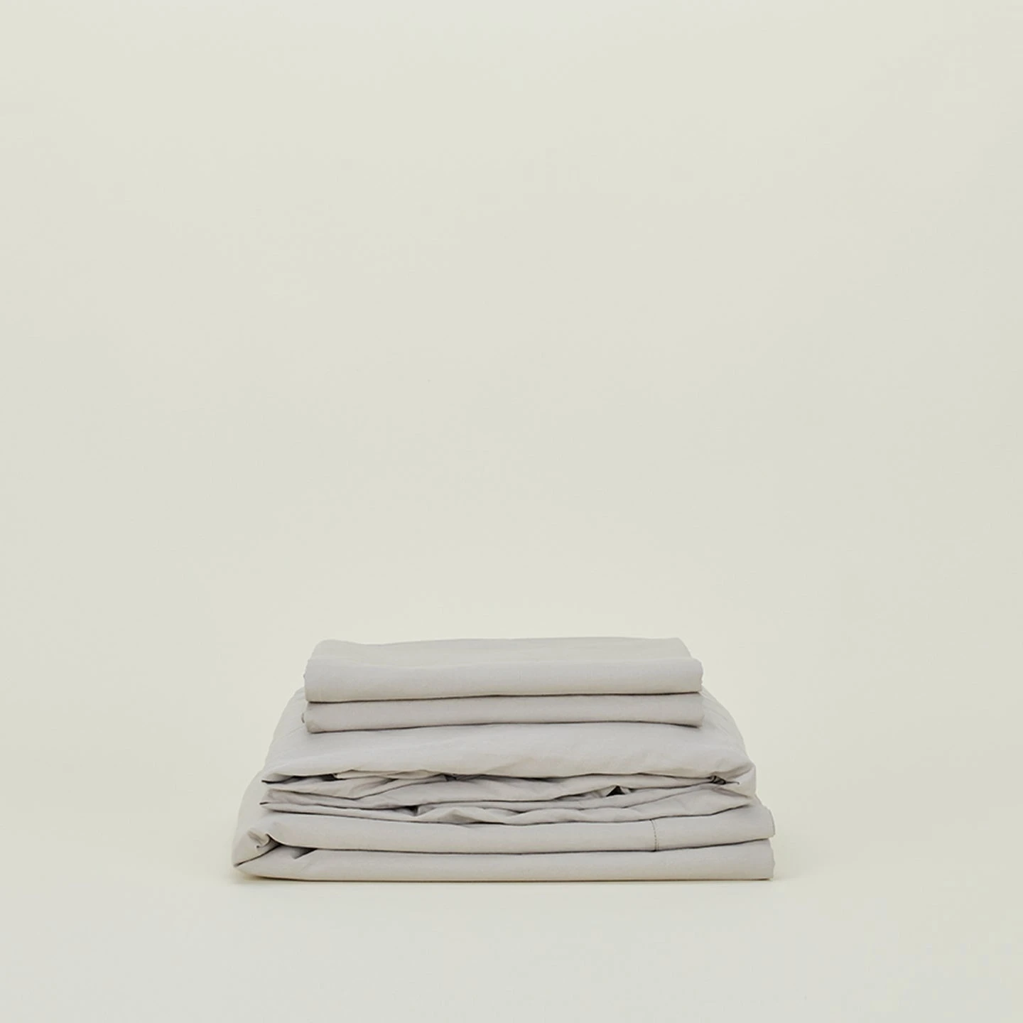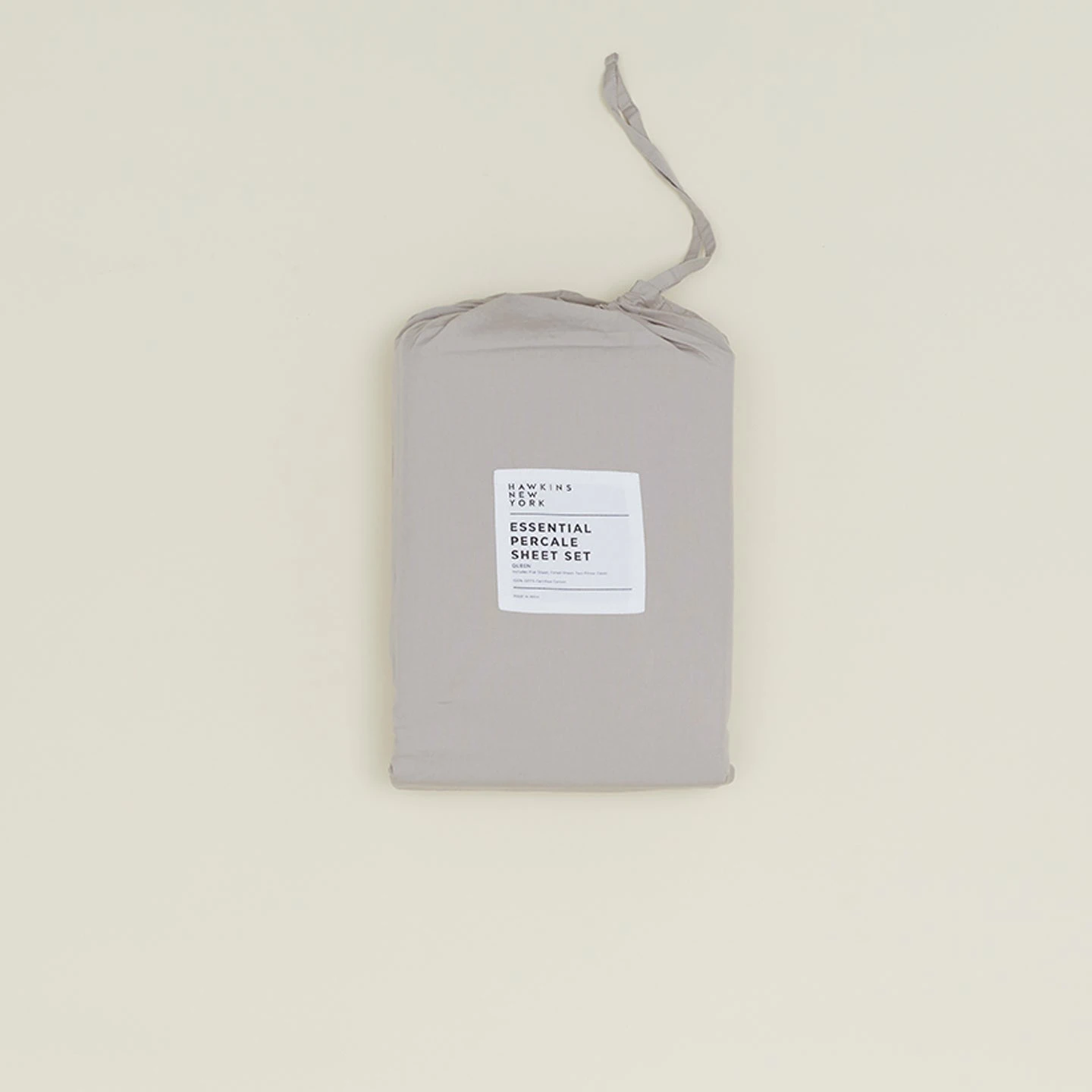 - A flat sheet, fitted sheet, + set of pillowcases in Hawkins percale
