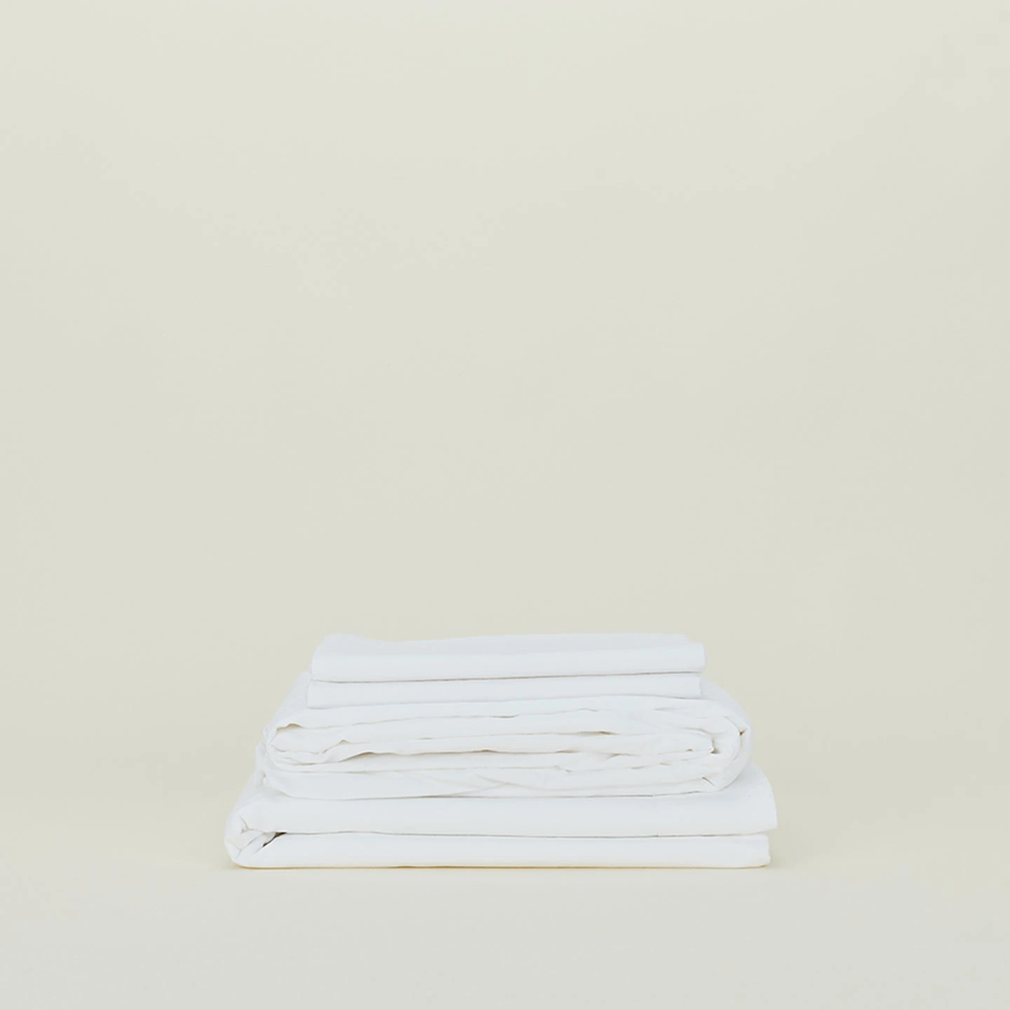 - A flat sheet, fitted sheet, + set of pillowcases in Hawkins percale