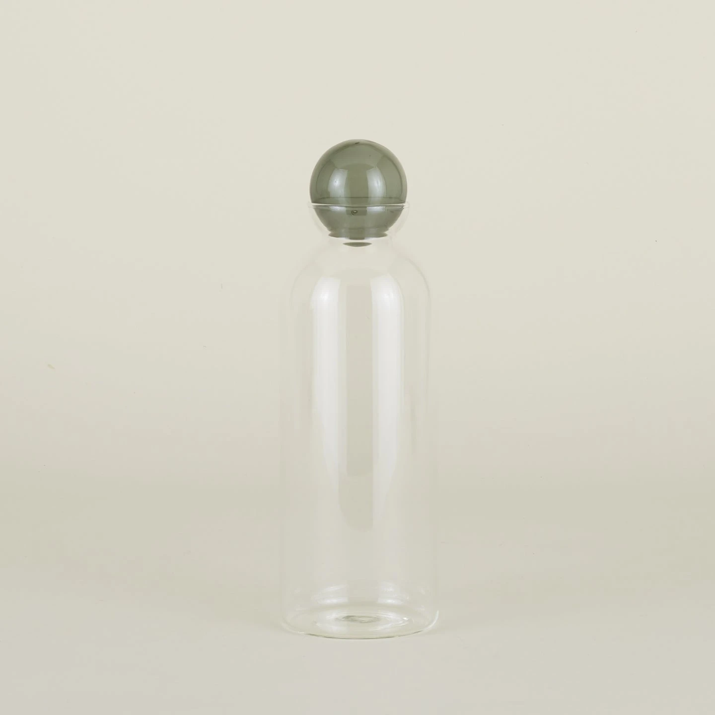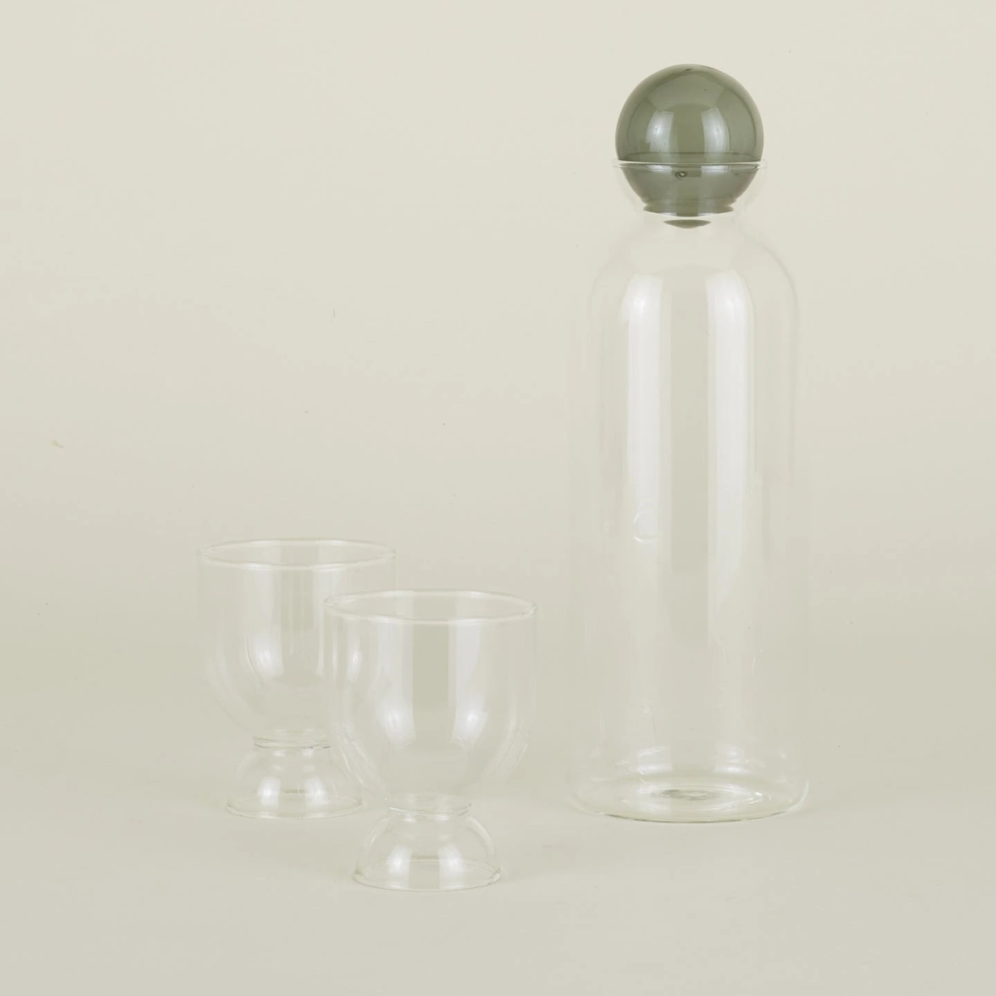 - Sphere-shaped colored glass stopper sits like a bubble of air on top of the mouth blown carafe