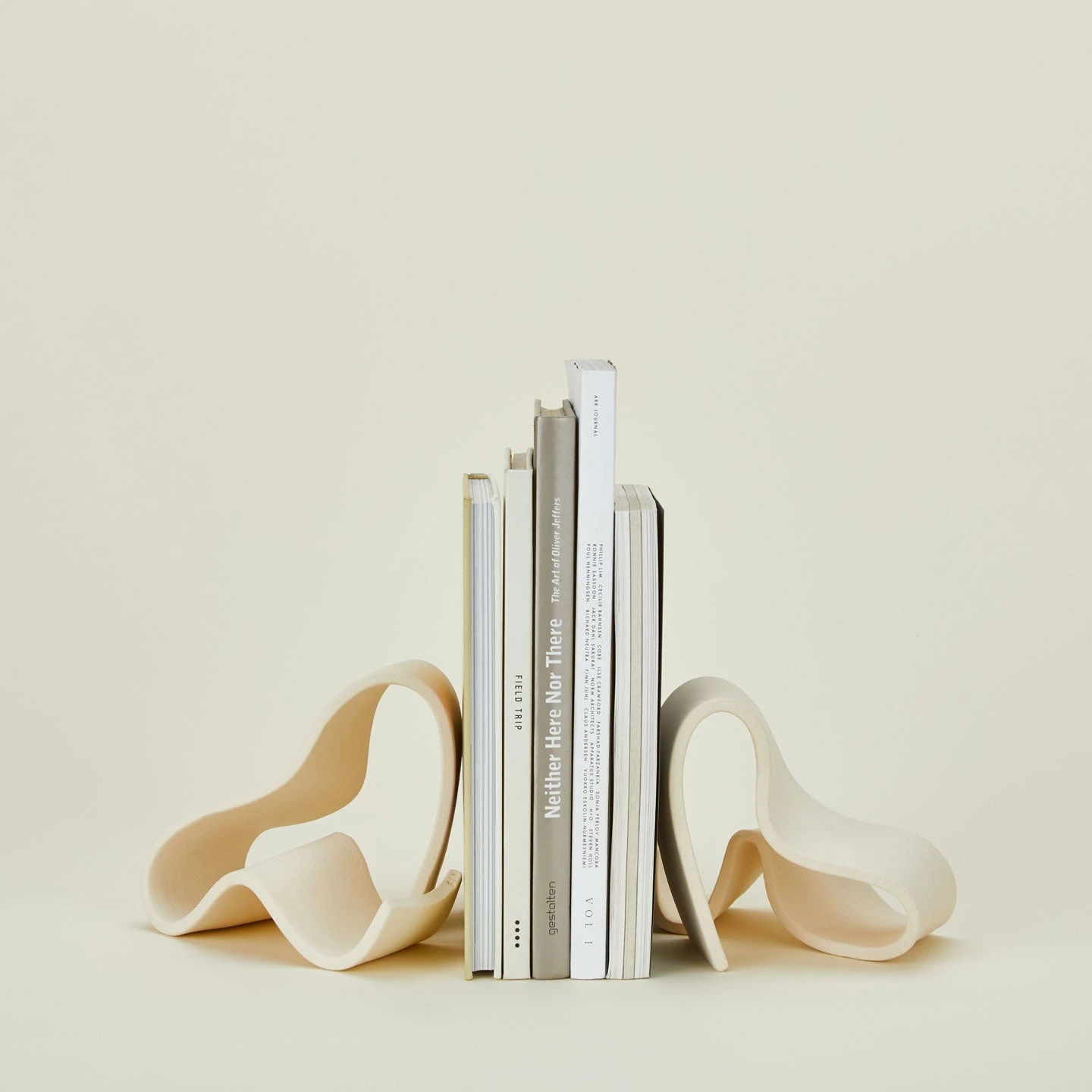 - Rhythmic shapes double as bookends or modern art