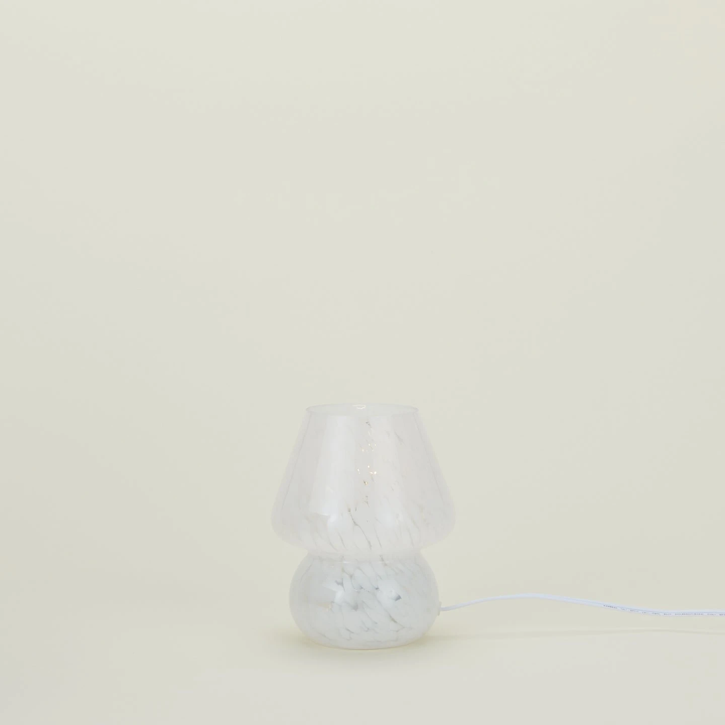 - Hand blown + hand crafted mini glass mushroom lamp in Confetti White