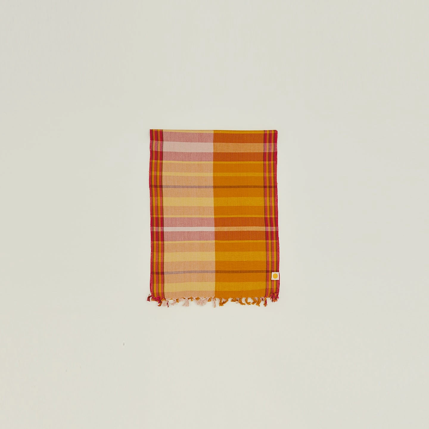 - Hand woven plaid runner with ochres, pink, + cream, plus a blue zigzag down the middle