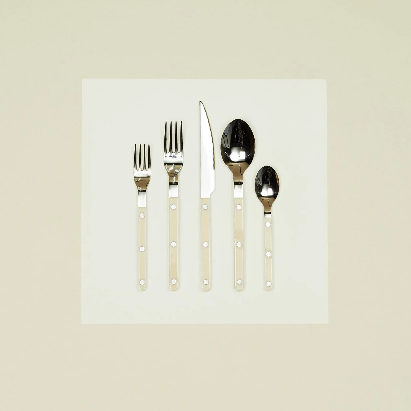 - 5-piece set includes dinner knife, salad + dinner forks, and dinner + dessert spoons
